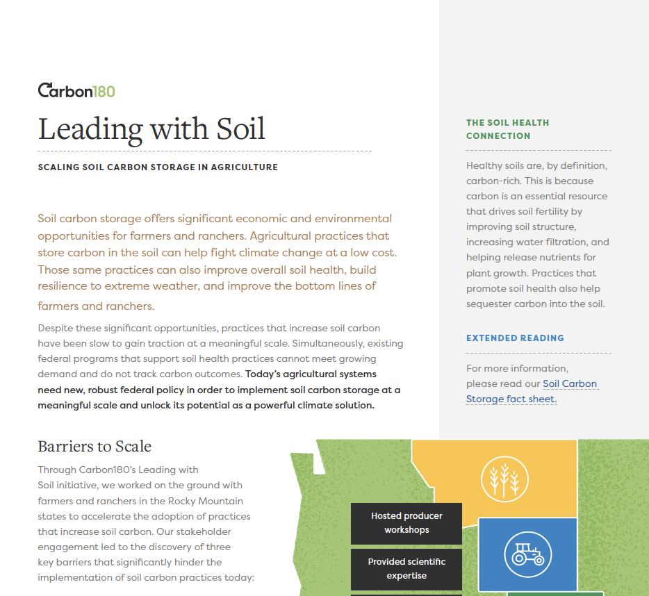 An overview of Carbon180’s Leading with Soil report, with a focus on recommendations for federal policies that can scale soil carbon storage in agriculture.